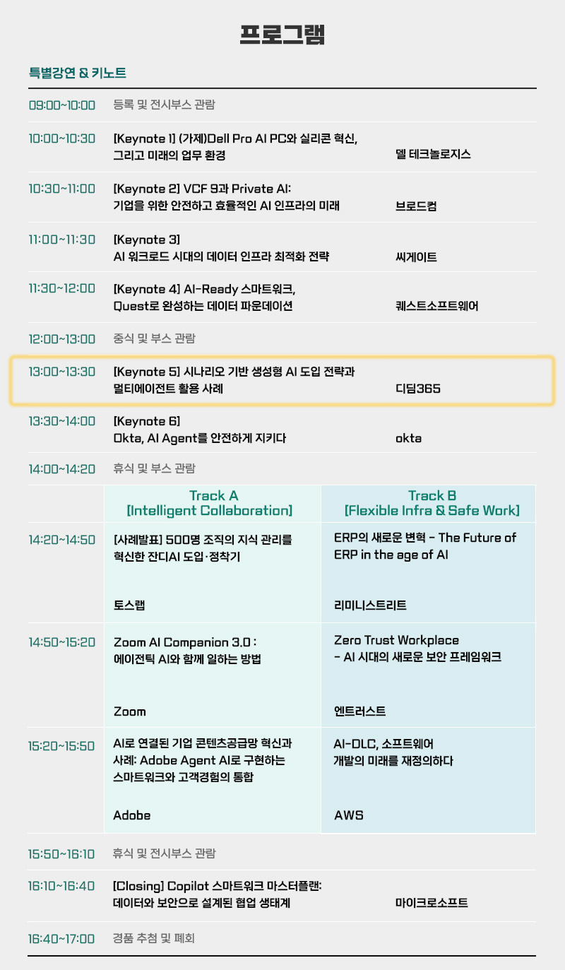 디딤365 부스에서 최신 AI·클라우드 기술을 직접 체험하고 디딤365 세션 발표를 통해 기업의 AI 도입 전략을 깊이 있게 확인하실 수 있습니다. 스마트워크 혁신을 주도하는 리더 여러분의 많은 관심과 방문을 기다립니다.